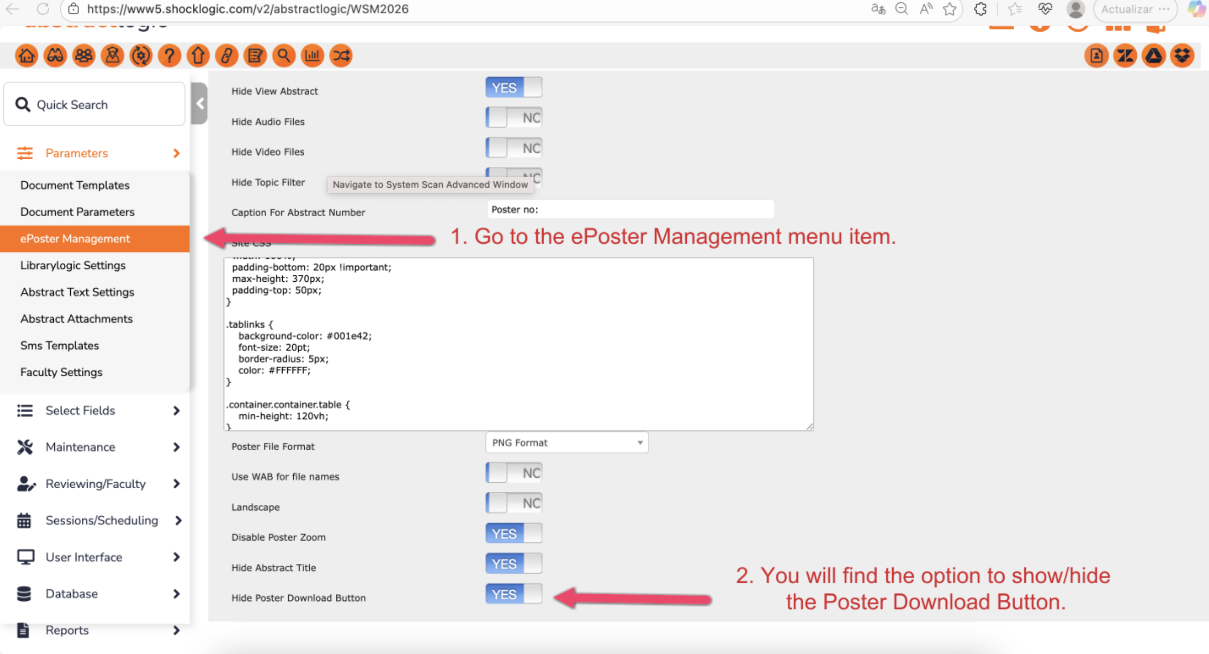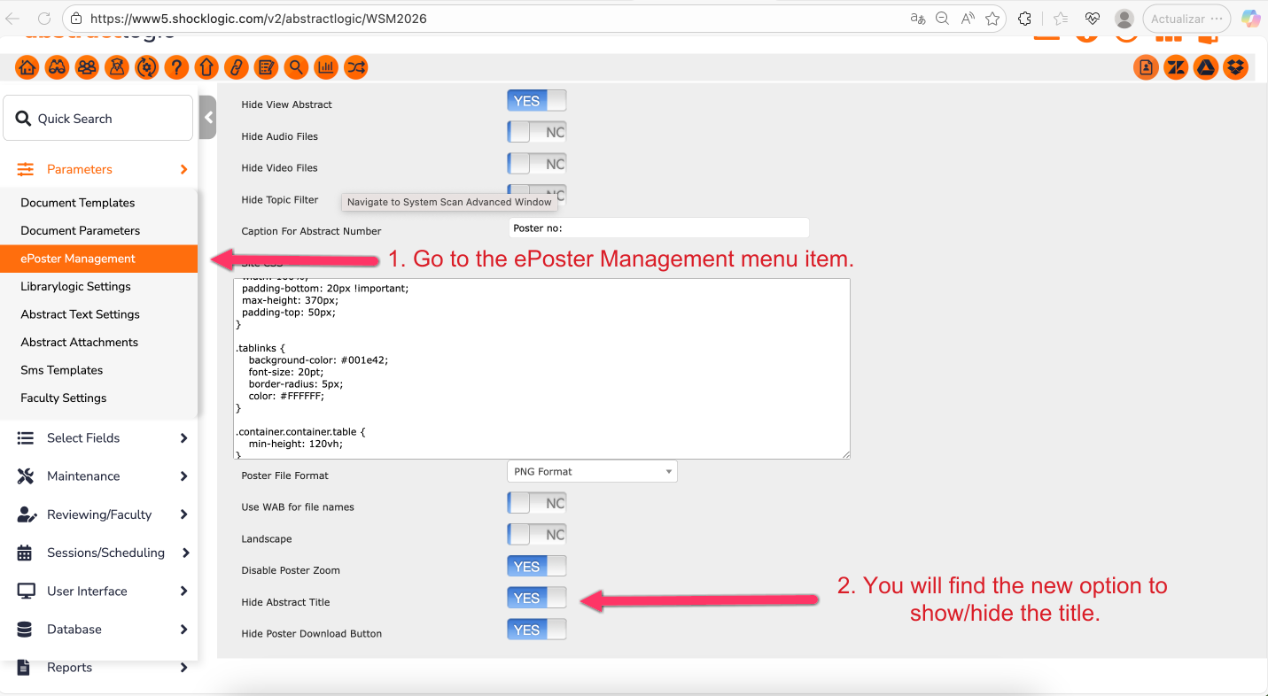 This article guides you through the new configuration options available in ePoster Management. These settings allow you to customise the end-user experience within the ePoster viewer by controlling the visibility of the abstract title, the download button, and the zoom functionality.
